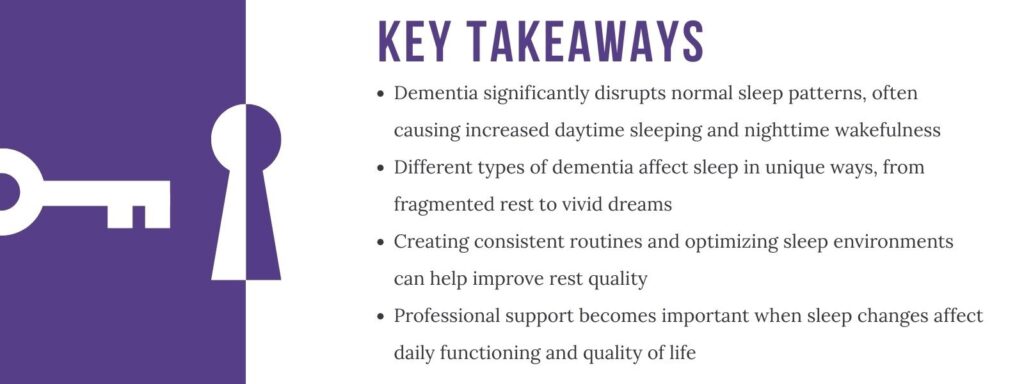 - Dementia significantly disrupts normal sleep patterns, often causing increased daytime sleeping and nighttime wakefulness